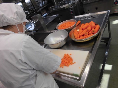 今日は、鶏肉やキャベツ、にんじん、お米が入ったスープでした。調理員さんが、にんじんをきれいにサイコロに切ってくれていました。