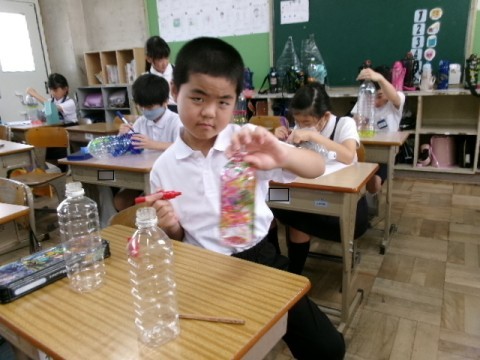 ペットボトルを使った制作をしています。水や光を通すときれいに見えるようで、喜んでいました。