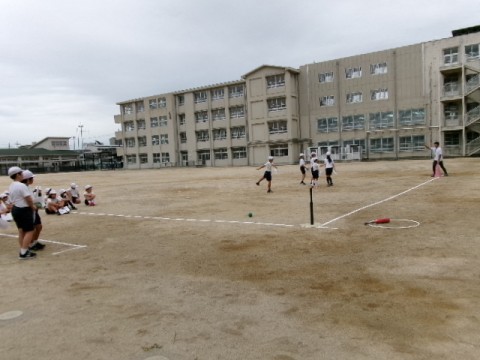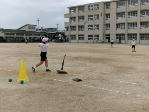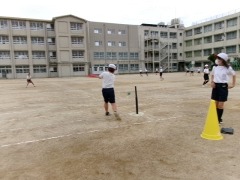 「ティーバッティング」の学習が始まりました。まずはルールを確認し,ティーに乗せたボールをバットで打ってみました。