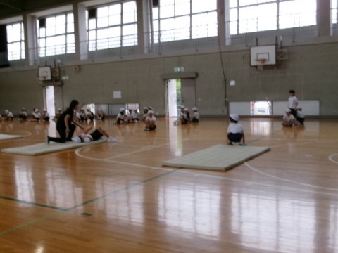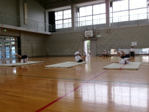 「マット運動」の学習です。「開脚後転」など,いろいろな技にチャレンジしています。