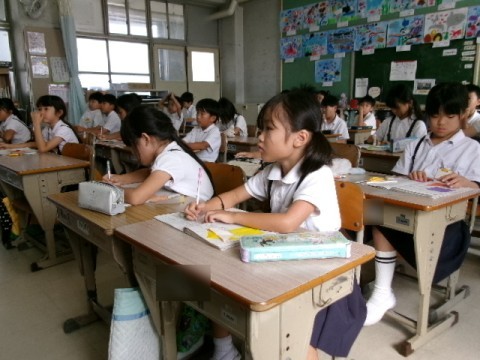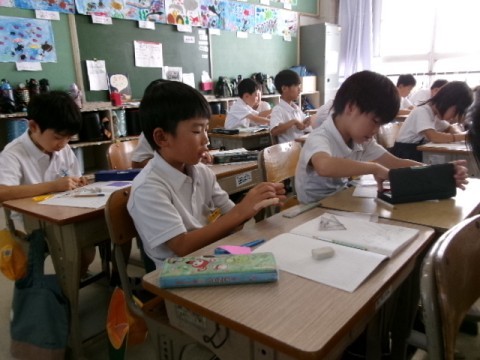 「長方形と正方形」の学習を進めています。折り紙を使って,「直角三角形」について学習しました。