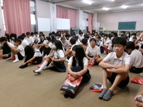 修学旅行のふりかえりをし,次の行事「連合運動会」に向けてのお話を聞きました。三宝小学校のユニフォームも配られ,気持ちを切り替えました。