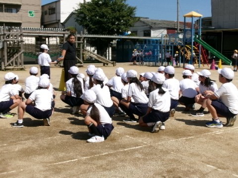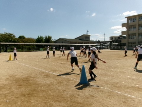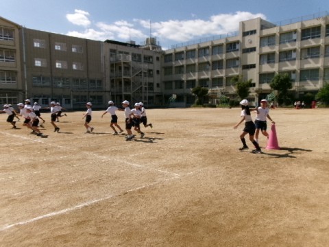 陸上運動「リレー」の学習です。どんなバトンの受け渡し方がよいかを,グループで考えました。