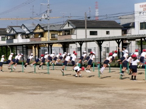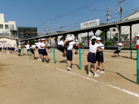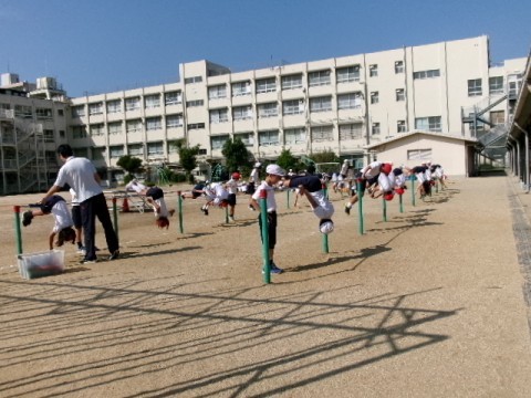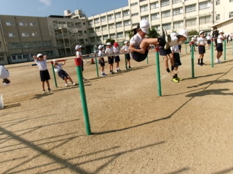 「鉄棒運動」の学習です。「逆上がり」「かかえこみ周り」にチャレンジしています。