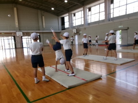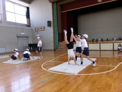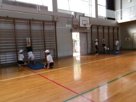 「マット運動」の学習です。「ロンダート」へつながる「倒立」の練習をしています。