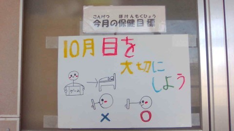 目を大切にするために、ゲームやタブレット,テレビの「使用時間を決めること」「目から離して見ること」するよう保健委員会さんがポスターを作り発表しました。