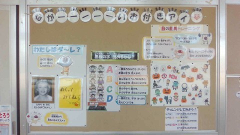 保健室前の掲示物も目について、『距離や視力によって見え方の変わる写真』,『視力について』,『ビジョントレーニング』を掲示しました。休み時間に子どもたちが楽しんで見ていて、目について興味をもつ機会になればと思っています。