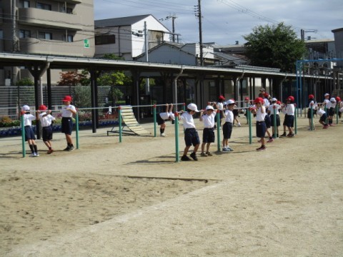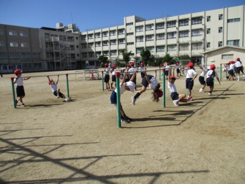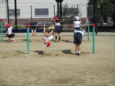 「鉄棒を使った運動あそび」の学習です。乗ったり回ったりなど,いろいろな技にチャレンジしています。