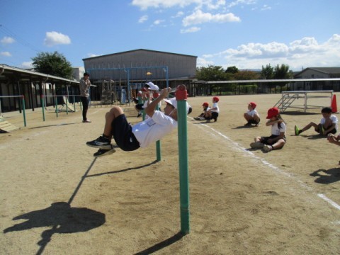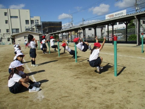 「鉄棒を使った運動あそび」の学習です。鉄棒に乗ったり,ぶらさがったりなど,いろいろな技に挑戦しました。