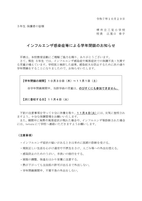 現在,5年生 では、インフルエンザ感染症や風邪症状での体調不良・欠席する児童が増えています。学校医と検討した結果、感染拡大を防止するために次の通り学級閉鎖をすることになりましたので、お知らせいたします。