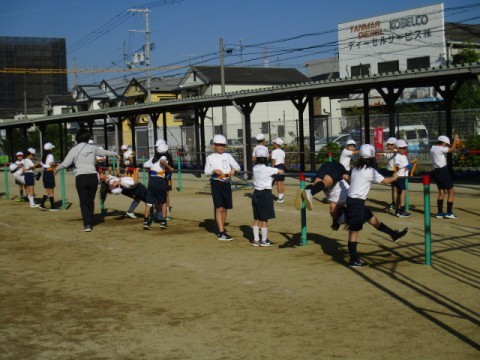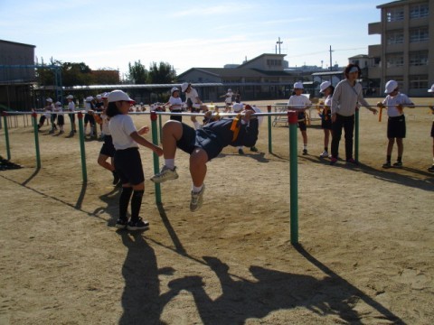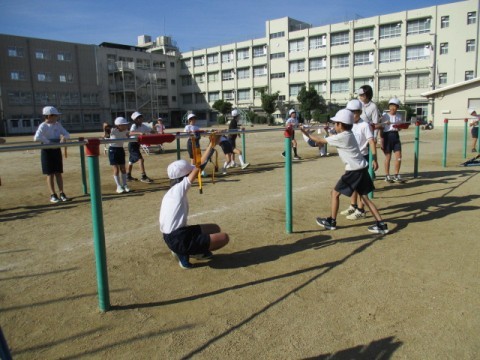 「鉄棒運動」の学習です。「さか上がり」など,いろいろな技に挑戦しています。