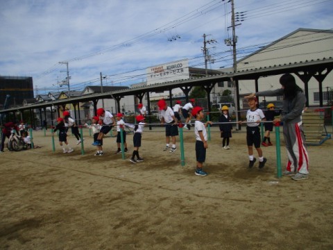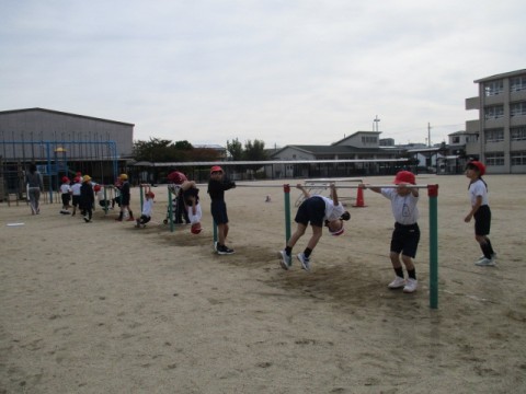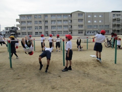 「鉄棒を使った運動あそび」の学習です。「さかあがり」など,いろいろな技に挑戦しています。
