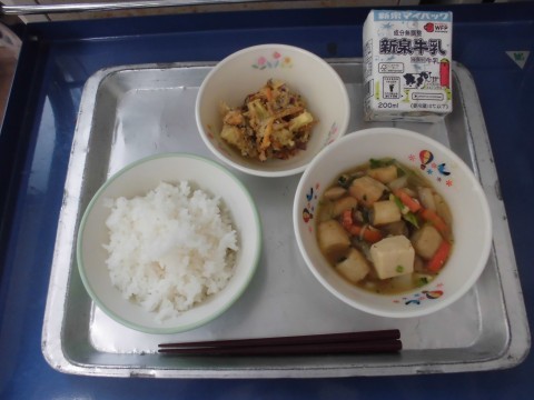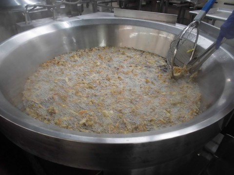 大きな釜で、玉ねぎ・ごぼう・にんじんなどの具と小麦粉を混ぜてた種を、少しづつ入れて揚げます。調理員さんが上手にきつね色にからっと揚げてくれたので、「カリカリって音がする」と言いながら食べていました。