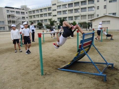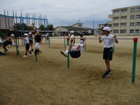 「鉄棒運動」の学習です。「さか上がり」の練習をがんばっています。
