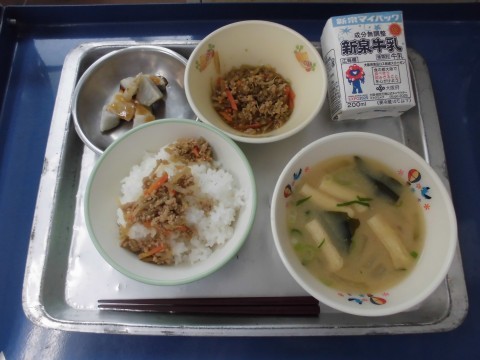 さといもは、親いもの横に子いもがたくさんできることから、子孫繁栄を願ってお正月にも食べられます。9月のお月見のころが収穫の時期と重なるので、お月見のことを「いも名月」とよぶ地域もあります。葉っぱが大きくて、子どもの傘にもなりそうな大きさです。子どもたちの反応は、「肉やと思ってた!」と献立表を見ずに食べている児童もいました。甘辛いタレがとってもおいしかったですよ。
