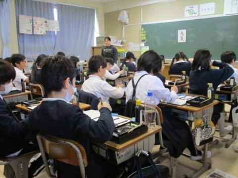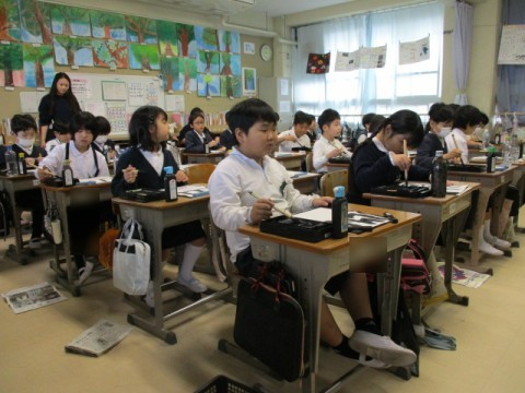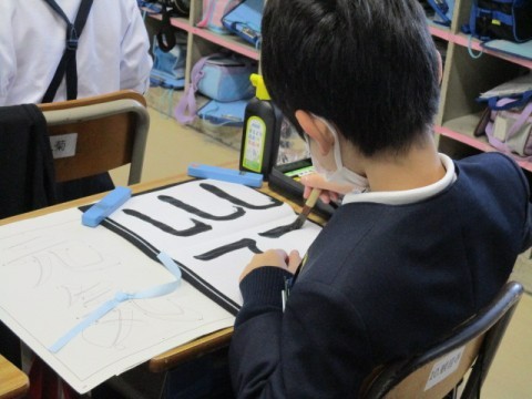 毛筆で「元気」と書きました。はねる部分を中心に練習をしました。