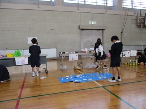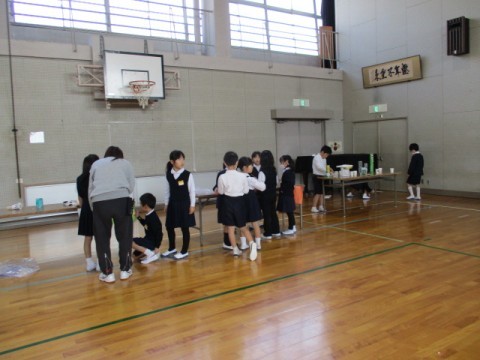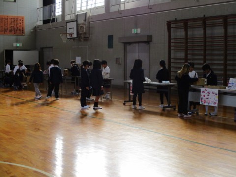 「おもちゃランド」の学習を進めています。今日は3クラスで体育館に集まり,お店の練習をしました。