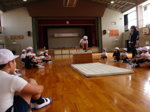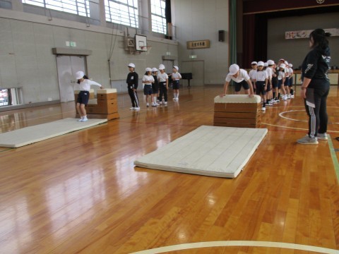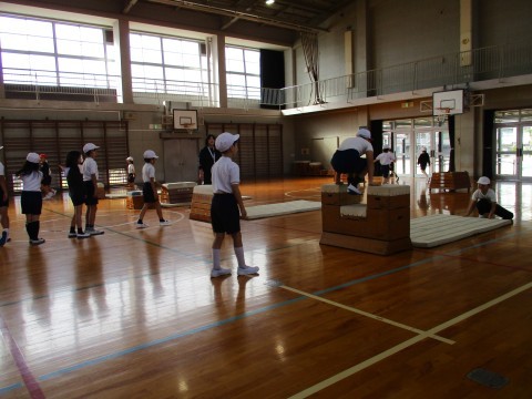 跳び箱運動の学習です。「かかえこみ跳び」にチャレンジしています。