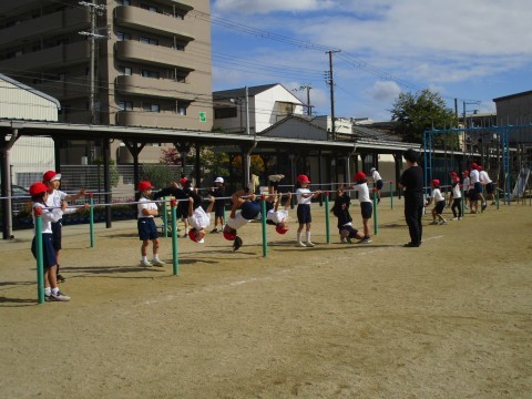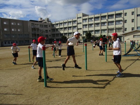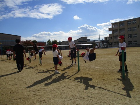 「鉄棒を使った運動あそび」の学習です。「さか上がり」など,いろいろな技に挑戦しています。