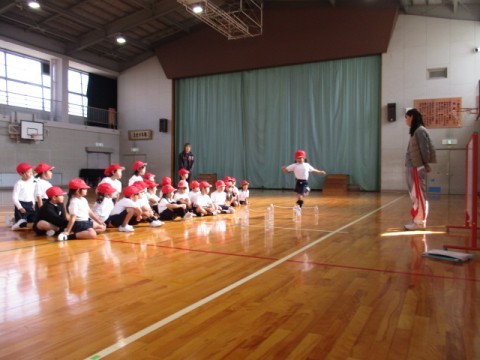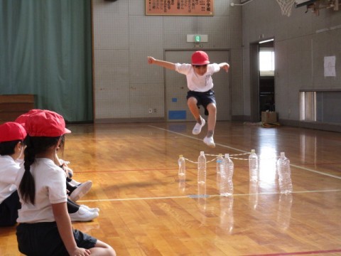 「体つくりの運動あそび」の学習です。いろいろな跳び方を考え,楽しく運動に取り組んでいます。