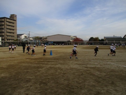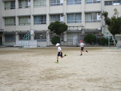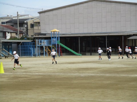 体育の学習のはじめには,「かけ足」に取り組んでいます。自分のペースでがんばっています。