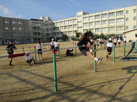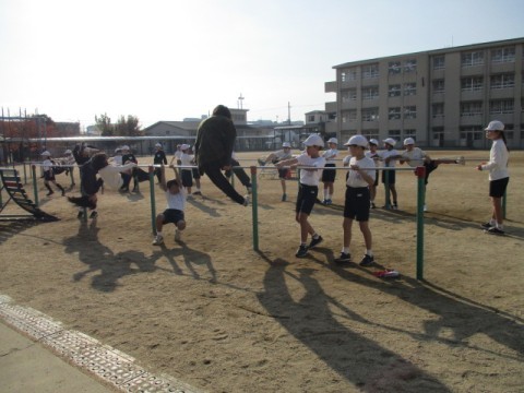 「鉄棒運動」の学習です。「ひざかけ上がり」にチャレンジしました。