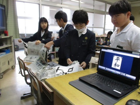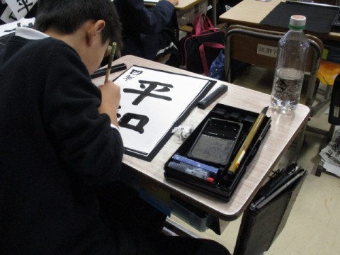 毛筆の学習です。「トメ・はらい」に気をつけて,「平和」と書きました。