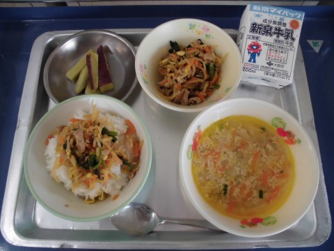 ビビンバは韓国料理で、ごはんにナムルや肉の炒めたものを混ぜて食べます。給食のビビンバは切干大根が入っていて、歯ごたえやボリュームがたっぷり。