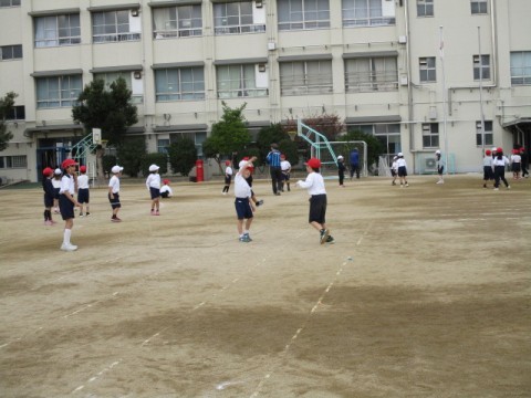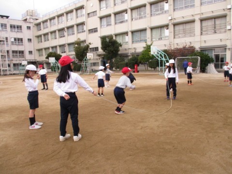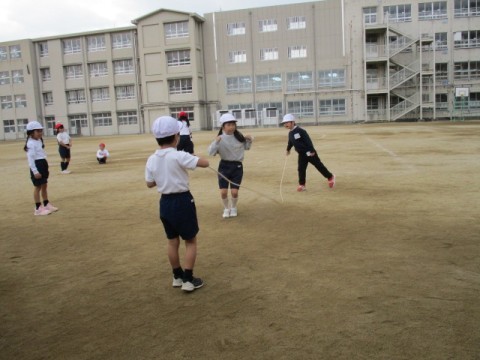 体つくりの運動あそび「大なわ」をしました。跳ぶタイミングが少しずつわかってきたようです。