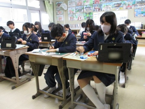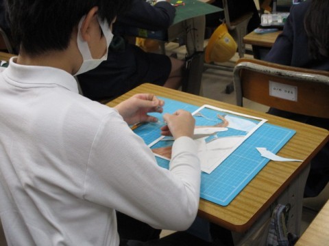 「切り絵」の制作です。絵の具を使いながら,細かい作業も丁寧に進めています。