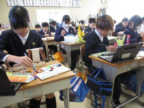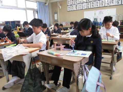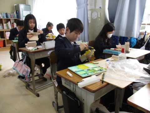 「のこぎりザクザク」の制作を進めています。組み立ても終わり,絵具で色ぬりをしています。