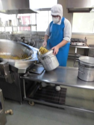 ところで、調理員さんのエプロンは、作業によって色分けしています。青色のエプロンは配缶する時のため。調理の時に使ったエプロンの時についた汚れが、できあがった料理に入らないように、エプロンを使い分けています。この他にも、洗浄用、肉や魚などを扱う時用などがあります。
