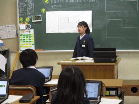 「面積」の学習を進めています。複合図形の面積の求め方を考えました。