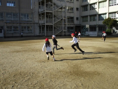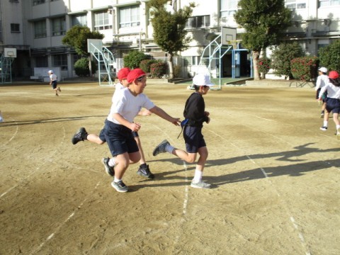 タグを使った「おにごっこ」をしました。肌寒い中での活動でしたが,子どもたちは元気に取り組んでいます。