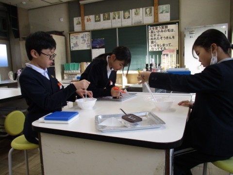 「ものの溶け方」の学習です。水の温度を上げたとき,水に溶ける物の量に変化はあるかを実験で確かめました。