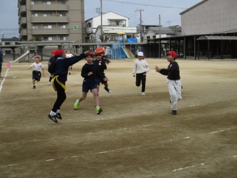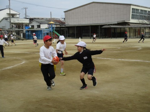 「パスゴールラグビー」の学習です。グループのお友だちと楽しく学習に取り組んでいます。