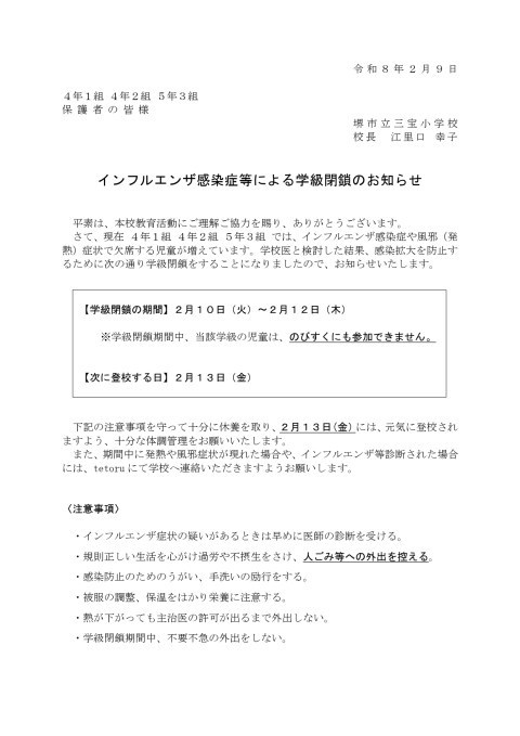 【4年1組 4年2組 5年3組 保護者の皆さま】インフルエンザ感染症等による学級閉鎖のお知らせ