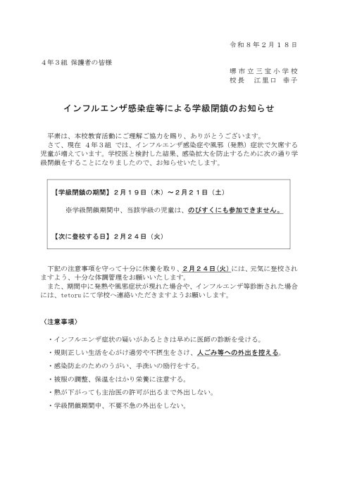 【4年3組 保護者の皆さま】インフルエンザ感染症等による学級閉鎖のお知らせ