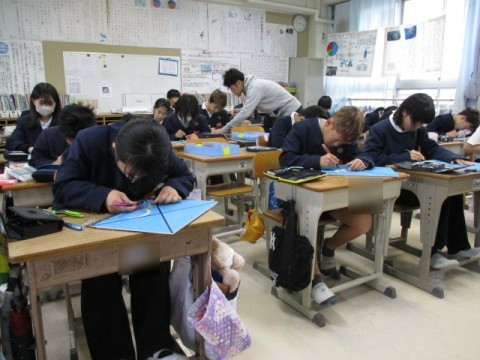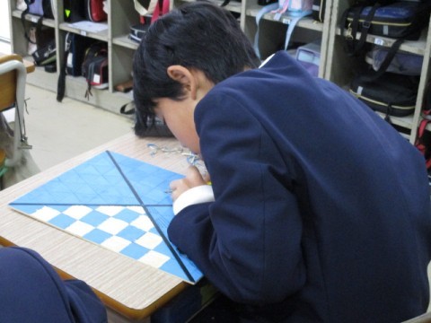 「版画」の制作を進めています。彫刻刀を使って,安全に気をつけながら丁寧に作業しています。