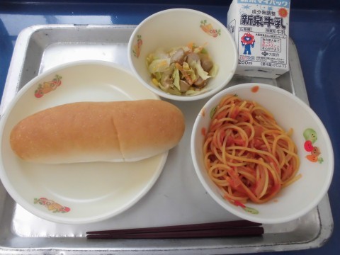 トマトがたっぷり入ったスパゲティのトマト煮。トマトのしっかりした味わいで、パンにぴったりの味付けでした。