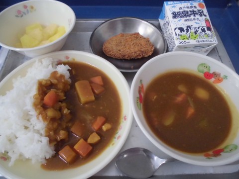 6年生は小学校で食べる最後の給食となりました。今日は人気メニューの、カレーライスでした。