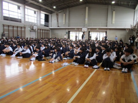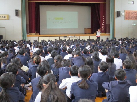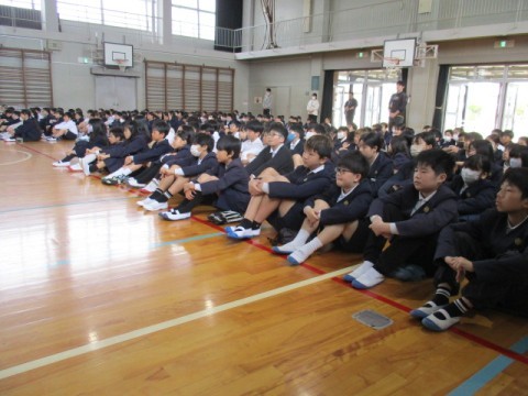 対面式のあと,「仲間づくり集会」をしました。先生からのお話を聞き,各クラスで「いじめ0メッセージ」について話し合いを進めていきます。