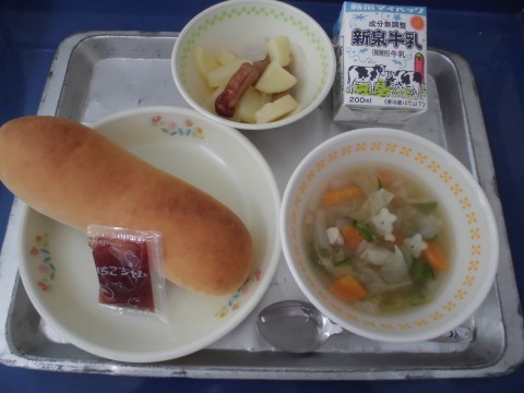今日のスープには、きぬさや、新玉ねぎが入って優しいあまさのスープでした。星形のお米でできたマカロニも入っていて、子どもたちもうれしそうに食べていましたよ。