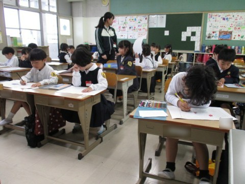 「こんなもの みつけたよ」の学習です。先日の「学校たんけん」をふりかえり,楽しかった場所を絵で表しました。