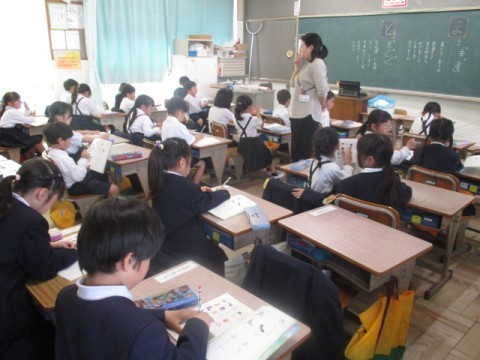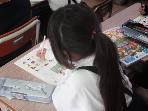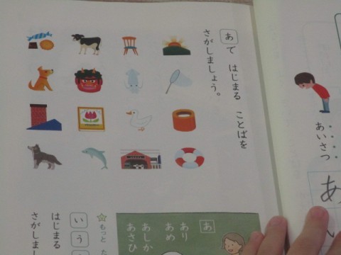 教科書に載っているいくつかの絵の中から、「あ」ではじまる言葉を探していました。