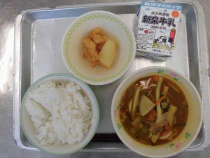6月9日(木)の献立はご飯 牛乳 カレーうどん 長崎天ぷらでした。長崎天ぷらは長崎県の郷土料理です。甘くて柔らかい衣が特徴です。衣に味がついているので、冷めてもおいしく食べられます。「よくかめよ」「ひみこの歯がいいぜ」「廊下歩行の歌」を歌いました。