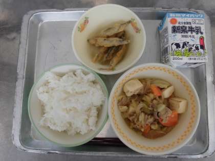 6月14日(火)の献立はご飯 牛乳 豚肉と野菜の甘辛煮 きびなごフライでした。「よくかんで食べよう」「ひみこの歯がいいぜ」「きびなごには骨がある」を歌いました。