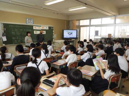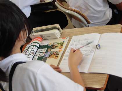 曜日の表現の学習をしています。「外国は夏休みが3か月間もある」「日本は外国に比べて安全な国」などを教わり,外国と日本の違いに驚いていました。