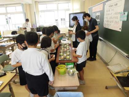 5回折りたたんだ和紙の角にいろんな色の色水をつけて,開いた時にできる模様を楽しみました。素敵な作品がたくさん出来上がりました。