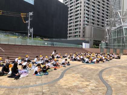 遅めのランチタイムです。予定通りに活動できています。科学館前で食べています。